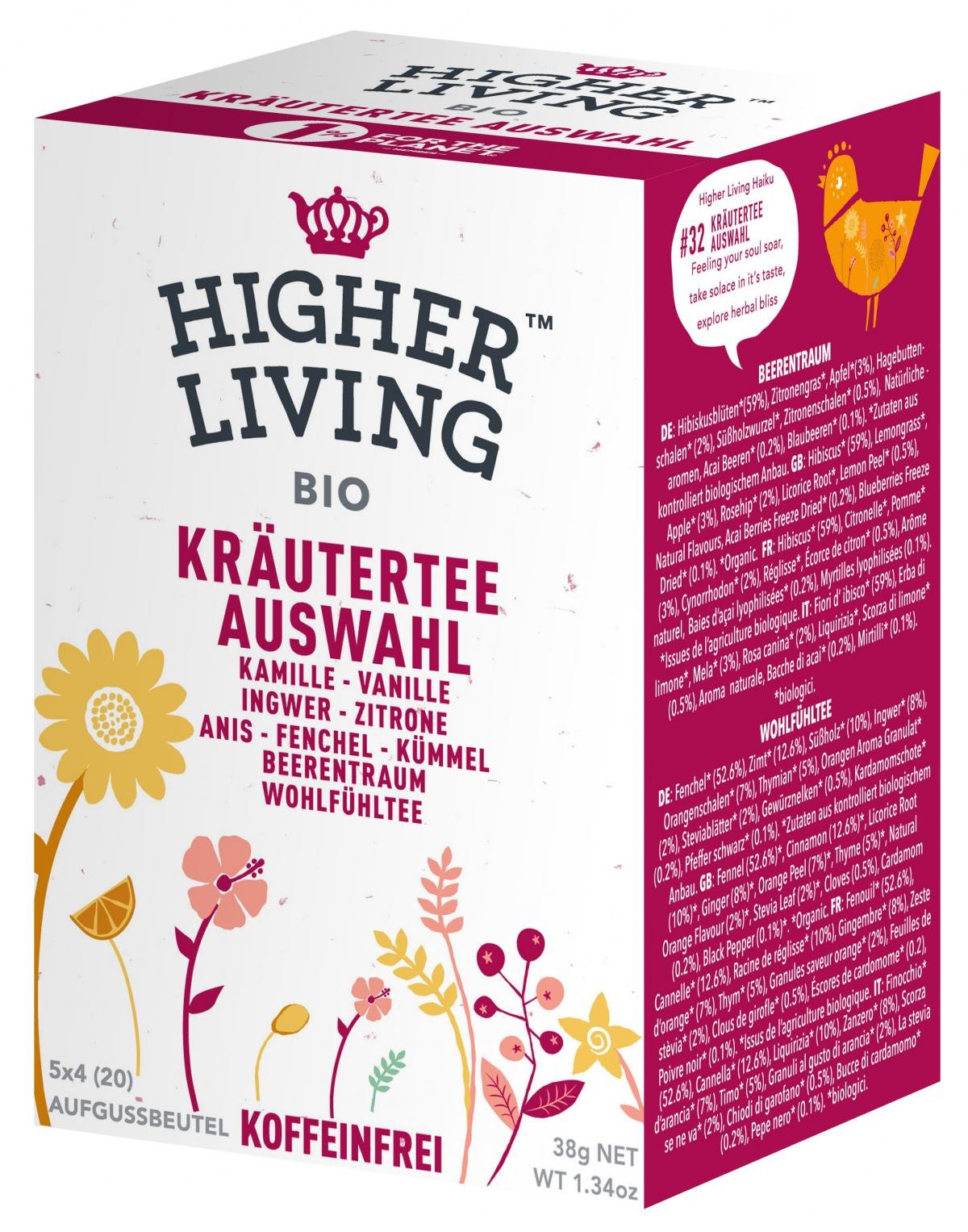 Higher Living Kräutertee Auswahl in neuer Sortierung.