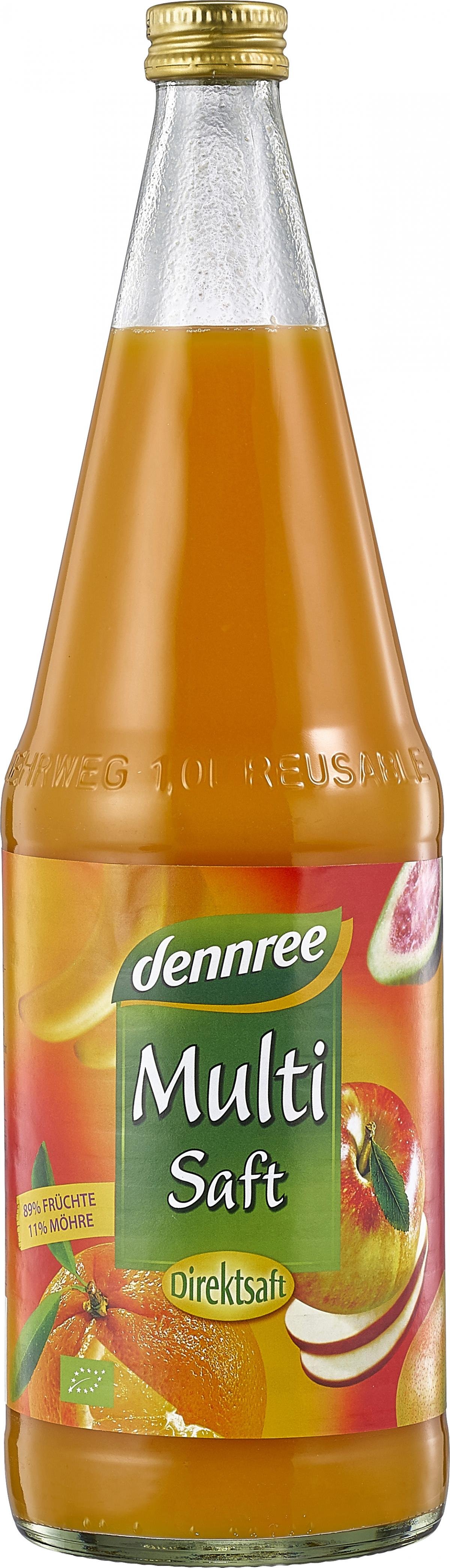 Bio-Multisaft bietet reinen Genuss. Ein leckeres Geschmackserlebnis - die Mischung macht's. dennree Multisaft ist eine gelungene Komposition aus Apfel-, Orangen-, Birnen-, Möhren-, Maracuja- und Granatapfelsaft, fein abgestimmt mit Fruchtmark von Mangos, Bananen und Guaven. Genießen Sie die fruchtige Vielfalt.