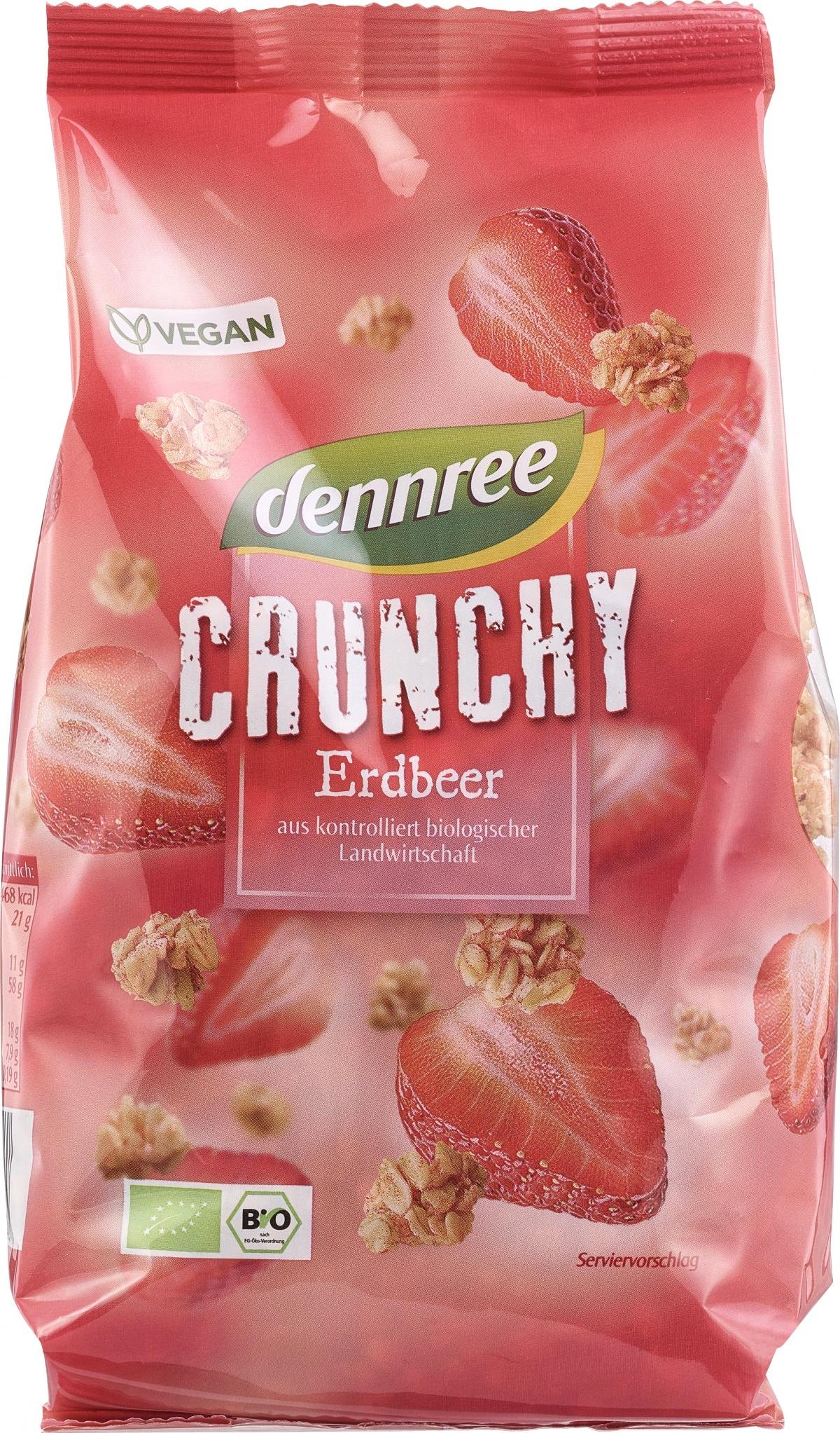 Bio-Erdbeer-Crunchy bietet reinen Genuss. Das dennree Erdbeer-Crunchy wird aus besten Hafervollkornflocken, Kokosraspel sowie Knusperreis schonend hergestellt und mit Erdbeeren verfeinert. Am besten schmeckt es mit frischer Milch, Joghurt oder als knusprige Zutat für's Müsli. Es bietet aber auch pur leckeren Knabberspaß für Groß und Klein. Genießen Sie den knusprig-fruchtigen Geschmack.