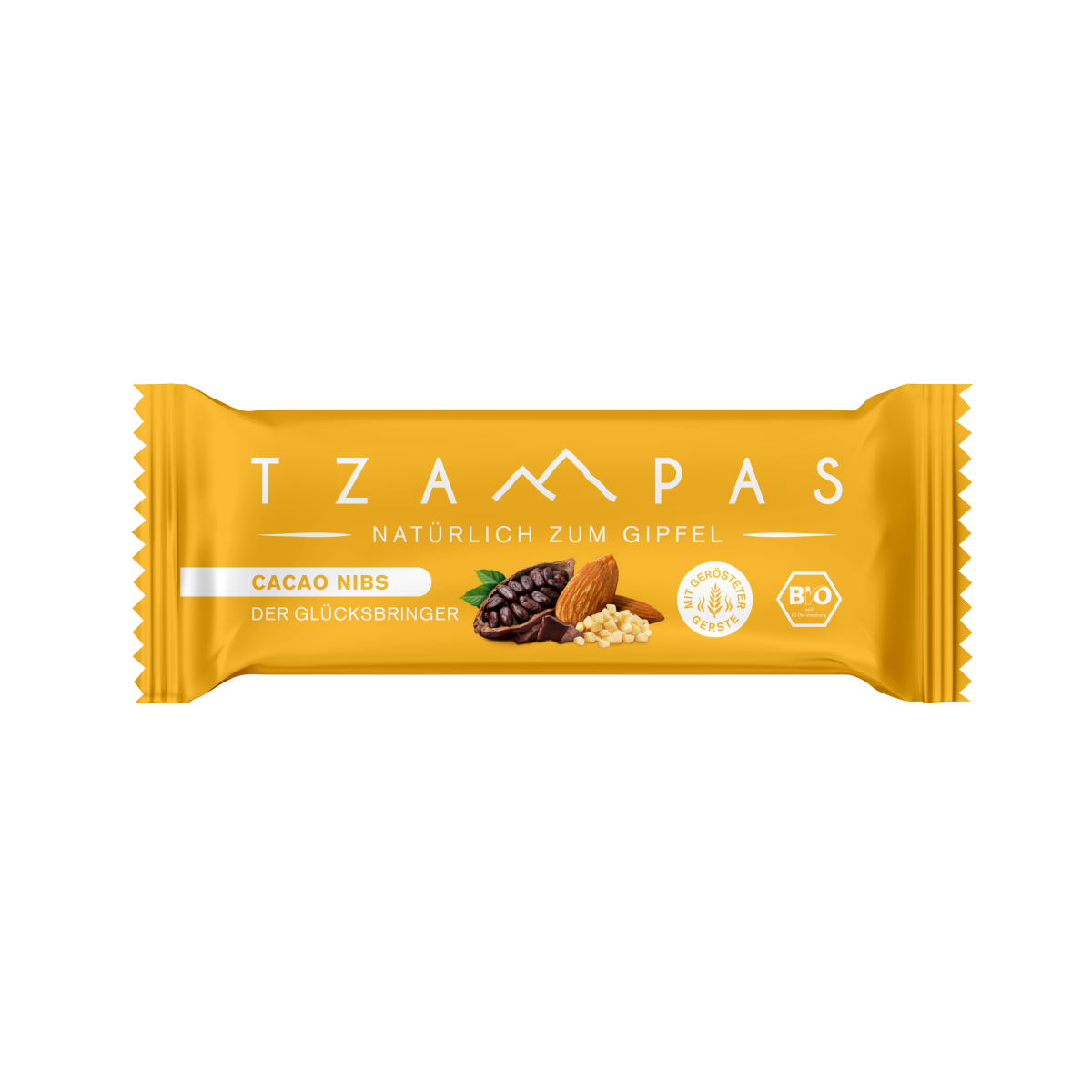 Der TZAMPAS Cacao Nibs Riegel vereinigt den mild-nussigen Geschmack gerösteter Bio-Gerste mit dem zartherben Aroma von Cacao Nibs.