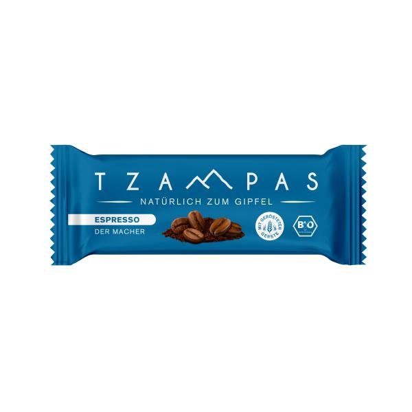 Kaffeefreunde aufgepasst! Hier kommt der TZAMPAS Espresso Riegel mit seiner unvergleichlichen Kombination aus nussig-mildem Gerstenmehl und kräftigen Kaffeebohnen.
