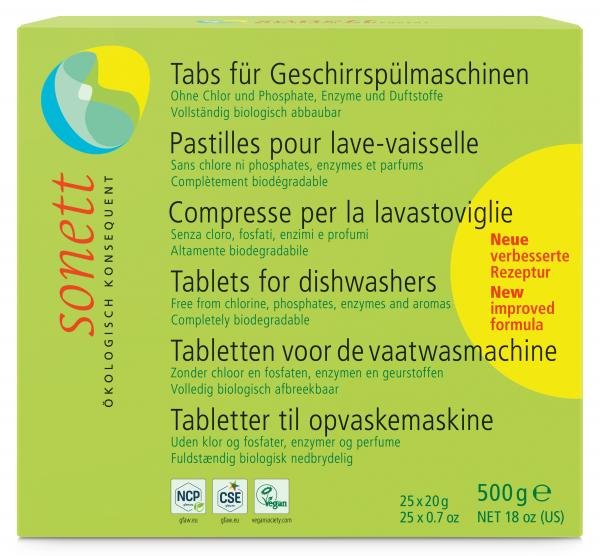 Die Sonett Tabs enthalten Mineralien und vollständig biologisch abbaubare organische Bestandteile. Sie sind zu 100% aus mineralischen und pflanzlichen Rohstoffen hergestellt und enthalten keine Enzyme, keine aggressiven chlorhaltigen Bleichmittel, keine Phosphate und keine Duftstoffe.
