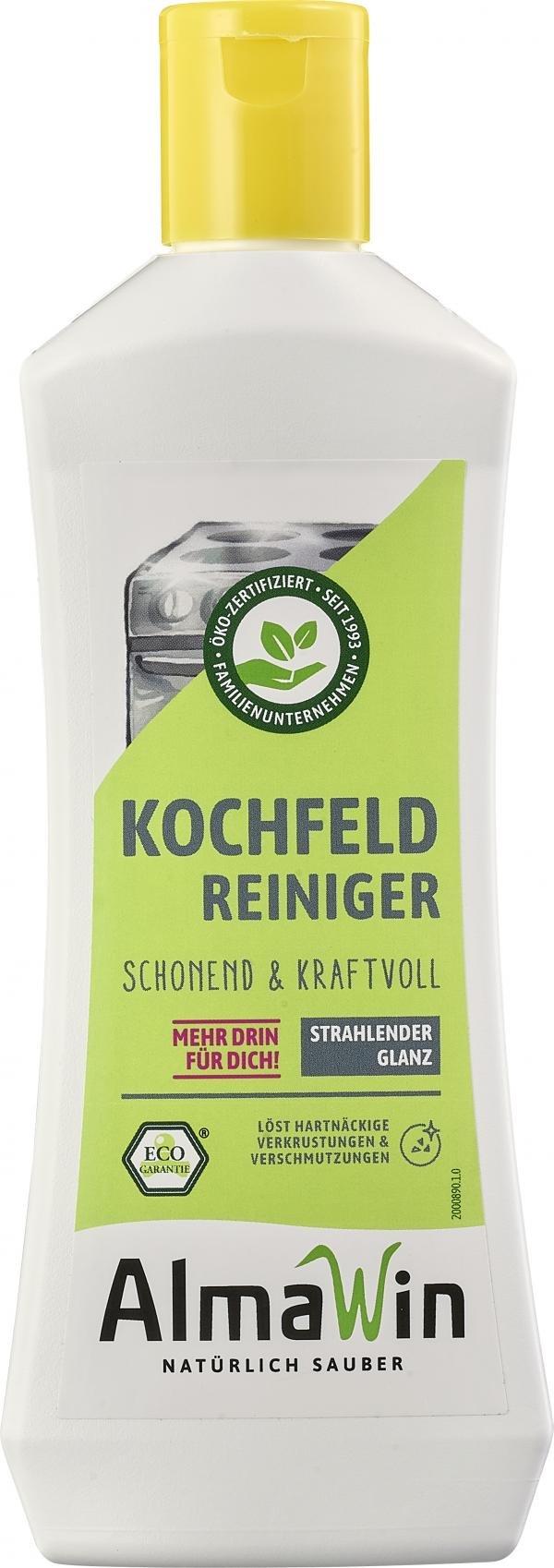 AlmaWin Kochfeld Reiniger reinigt und pflegt Glaskochfelder und Induktionsherde glänzend sauber ohne zu Kratzen.